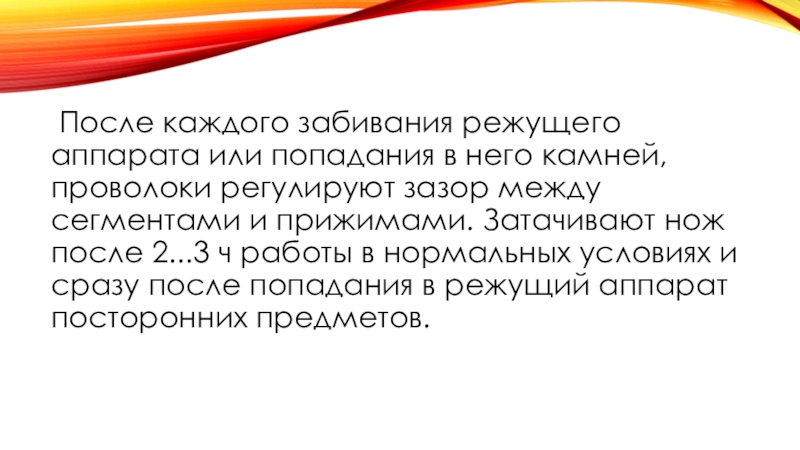 Слайд 3 После каждого забивания режущего аппарата или попадания в него камней,