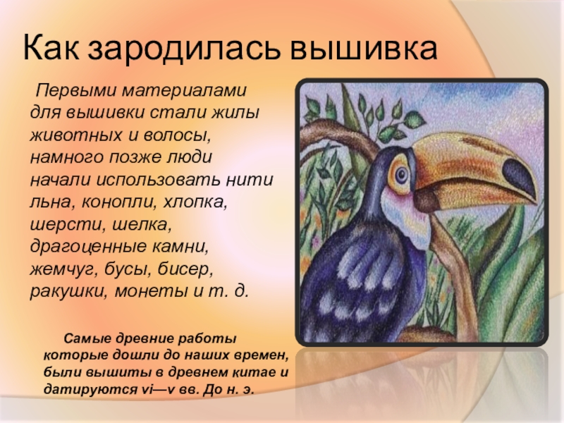 Самые древние работы которые дошли до наших времен, были вышиты в древнем китае и датируются vi—v вв. До н. э.