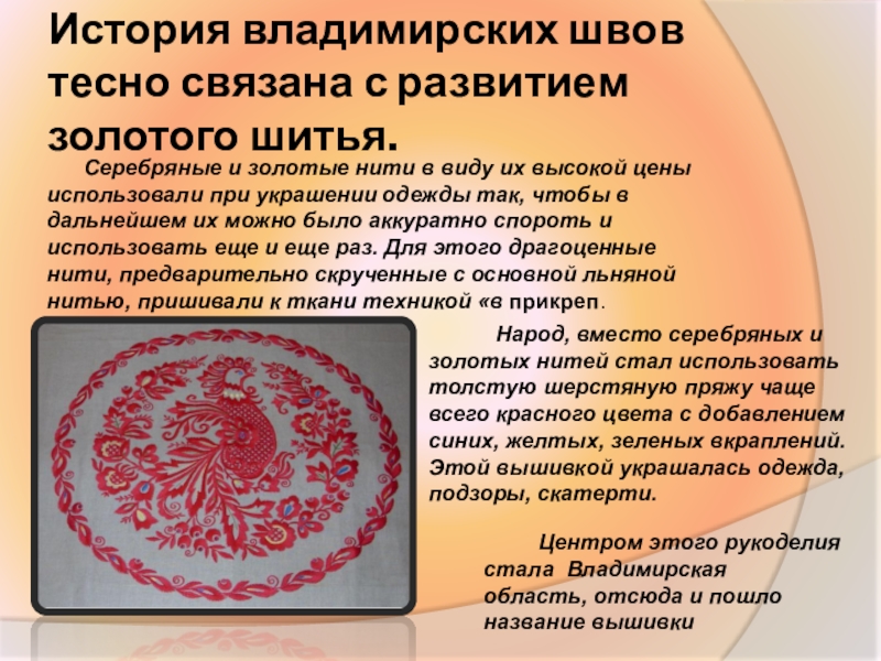 Центром этого рукоделия стала Владимирская область, отсюда и пошло название вышивки