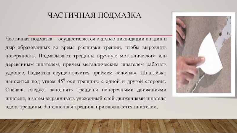 образованных во время расшивки трещин, чтобы выровнять поверхность. Подмазывают трещины вручную металлическим или деревянным шпателем, причем металлическим шпателем работать удобнее. Подмазка осуществляется приёмом «ёлочка». Шпатлёвка наносится под углом 450 оси трещины с одной и другой стороны. Сначала следует заполнять трещины поперечными движениями шпателя, а затем выравнивать уложенный слой движениями шпателя вдоль трещины. Заполненная трещина приглаживается шпателем.