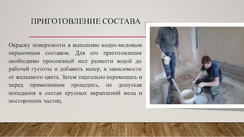 Окраску поверхности я выполняю водно-меловым окрасочным составом. Для его приготовления