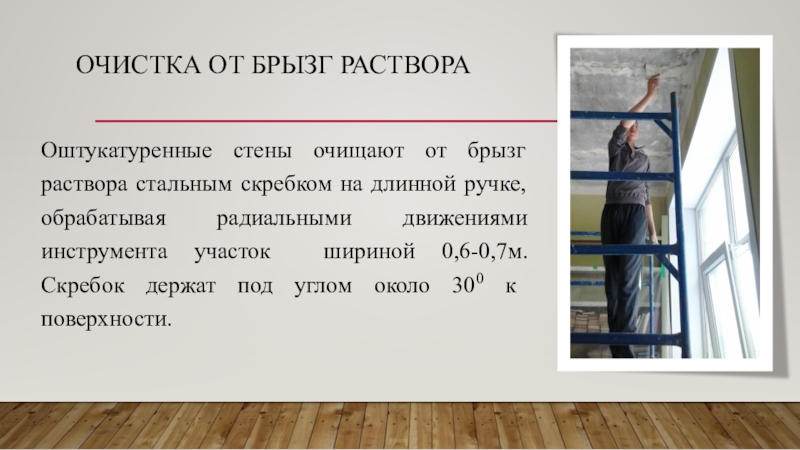 Оштукатуренные стены очищают от брызг раствора стальным скребком