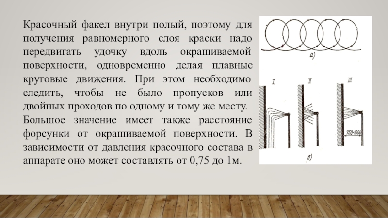 Большое значение имеет также расстояние форсунки от окрашиваемой поверхности. В зависимости от давления красочного состава в аппарате оно может составлять от 0,75 до 1м.