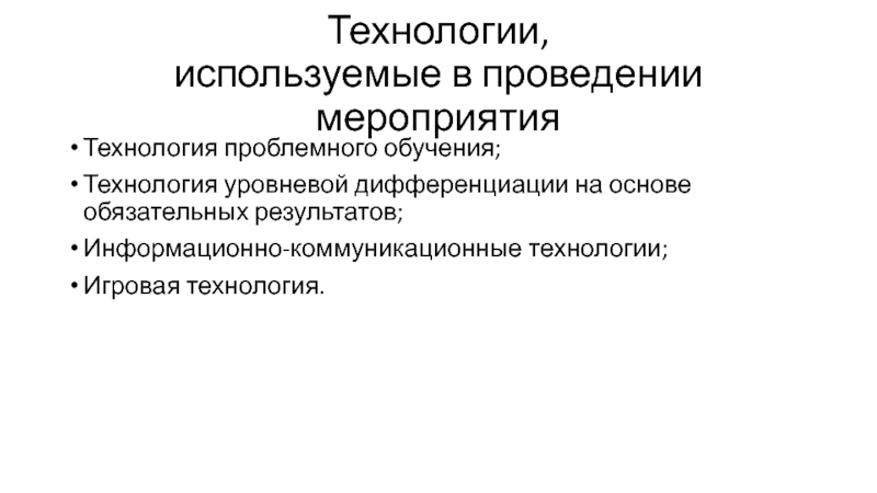 Технологии, используемые в проведении мероприятияТехнология проблемного обучения;Технология уровневой дифференциации на основе обязательных результатов;Информационно-коммуникационные технологии;Игровая технология.