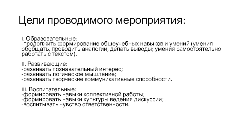 Цели проводимого мероприятия: I. Образовательные:  -продолжить формирование общеучебных навыков и умений (умения обобщать, проводить аналогии, делать