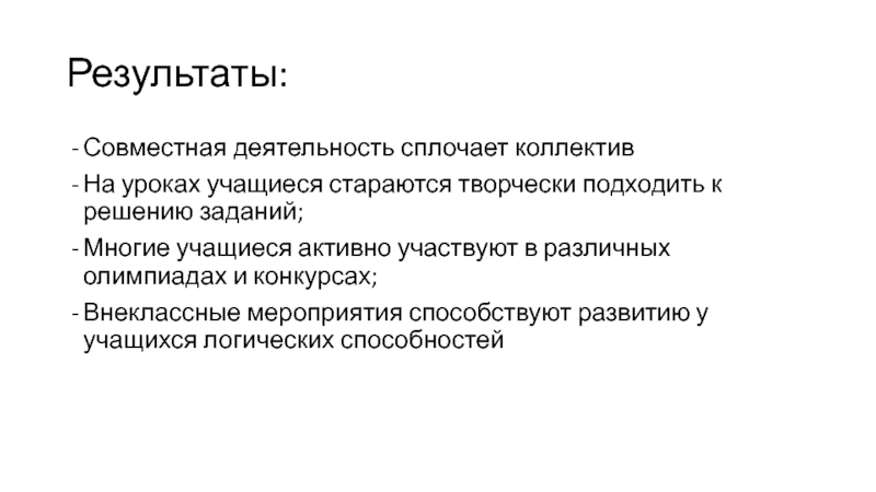 Результаты: Совместная деятельность сплочает коллективНа уроках учащиеся стараются творчески подходить к решению заданий;Многие учащиеся активно участвуют в
