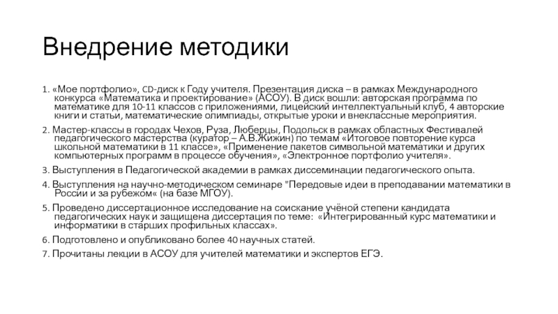 Внедрение методики1. «Мое портфолио», CD-диск к Году учителя. Презентация диска – в рамках Международного конкурса «Математика и