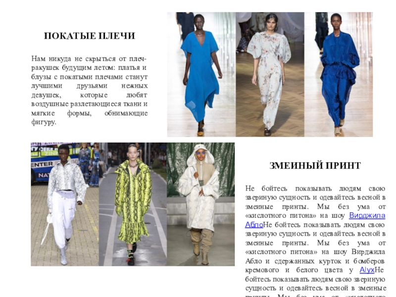 Не бойтесь показывать людям свою звериную сущность и одевайтесь весной в змеиные принты. Мы без ума от «кислотного питона» на шоу Вирджила АблоНе бойтесь показывать людям свою звериную сущность и одевайтесь весной в змеиные принты. Мы без ума от «кислотного питона» на шоу Вирджила Абло и сдержанных курток и бомберов кремового и белого цвета у AlyxНе бойтесь показывать людям свою звериную сущность и одевайтесь весной в змеиные принты. Мы без ума от «кислотного питона» на шоу Вирджила Абло и сдержанных курток и бомберов кремового и белого цвета у Alyx и Natasha Zinko.