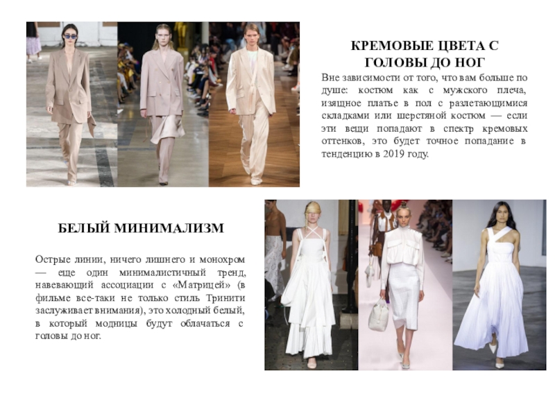 Острые линии, ничего лишнего и монохром — еще один минималистичный тренд, навевающий ассоциации с «Матрицей» (в фильме все-таки не только стиль Тринити заслуживает внимания), это холодный белый, в который модницы будут облачаться с головы до ног.