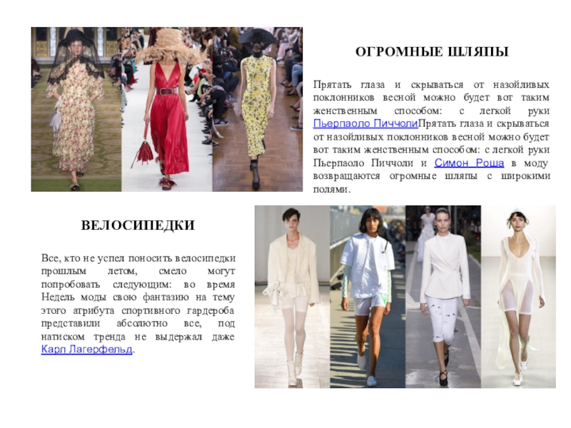 Все, кто не успел поносить велосипедки прошлым летом, смело могут попробовать следующим: во время Недель моды свою фантазию на тему этого атрибута спортивного гардероба представили абсолютно все, под натиском тренда не выдержал даже Карл Лагерфельд.