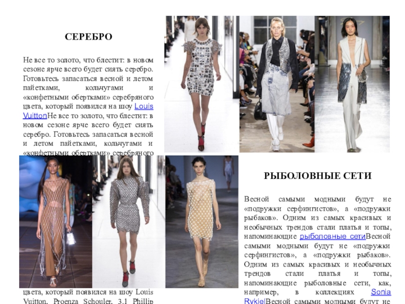 Весной самыми модными будут не «подружки серфингистов», а «подружки рыбаков». Одним из самых красивых и необычных трендов стали платья и топы, напоминающие рыболовные сетиВесной самыми модными будут не «подружки серфингистов», а «подружки рыбаков». Одним из самых красивых и необычных трендов стали платья и топы, напоминающие рыболовные сети, как, например, в коллекциях Sonia RykielВесной самыми модными будут не «подружки серфингистов», а «подружки рыбаков». Одним из самых красивых и необычных трендов стали платья и топы, напоминающие рыболовные сети, как, например, в коллекциях Sonia Rykiel, AltuzarraВесной самыми модными будут не «подружки серфингистов», а «подружки рыбаков». Одним из самых красивых и необычных трендов стали платья и топы, напоминающие рыболовные сети, как, например, в коллекциях Sonia Rykiel, Altuzarra, Ports 1961 и многих других