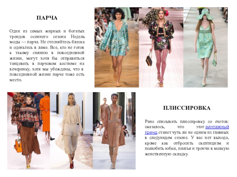 Рано списывать плиссировку со счетов: оказалось, что этот винтажный тренд станет чуть ли не одним из главных в следующем сезоне. У вас нет выхода, кроме как отбросить скептицизм и полюбить юбки, платья и тренчи в мелкую женственную складку.