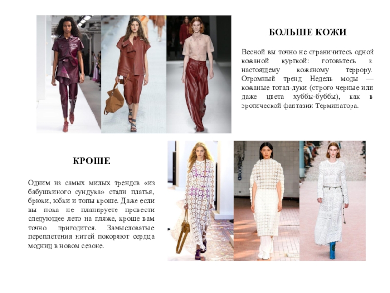 Одним из самых милых трендов «из бабушкиного сундука» стали платья, брюки, юбки и топы кроше. Даже если вы пока не планируете провести следующее лето на пляже, кроше вам точно пригодится. Замысловатые переплетения нитей покоряют сердца модниц в новом сезоне.