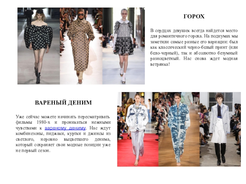 Уже сейчас можете начинать пересматривать фильмы 1980-х и проникаться нежными чувствами к вареному дениму. Нас ждут комбинезоны, пиджаки, куртки и джинсы из светлого, неровно выцветшего денима, который сохраняет свои модные позиции уже не первый сезон.