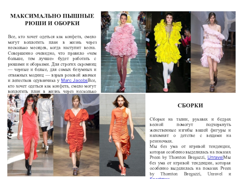 Сборки на талии, рукавах и бедрах весной помогут подчеркнуть женственные изгибы вашей фигуры и напомнят о детстве с вещами на резиночках.