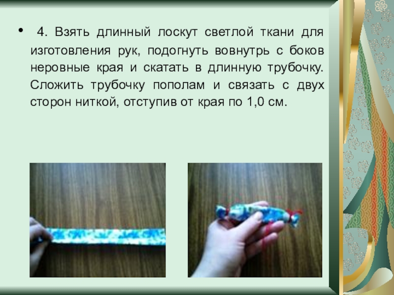 Слайд 8 4. Взять длинный лоскут светлой ткани для изготовления рук, подогнуть