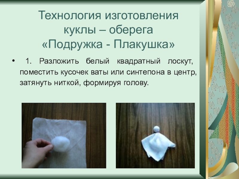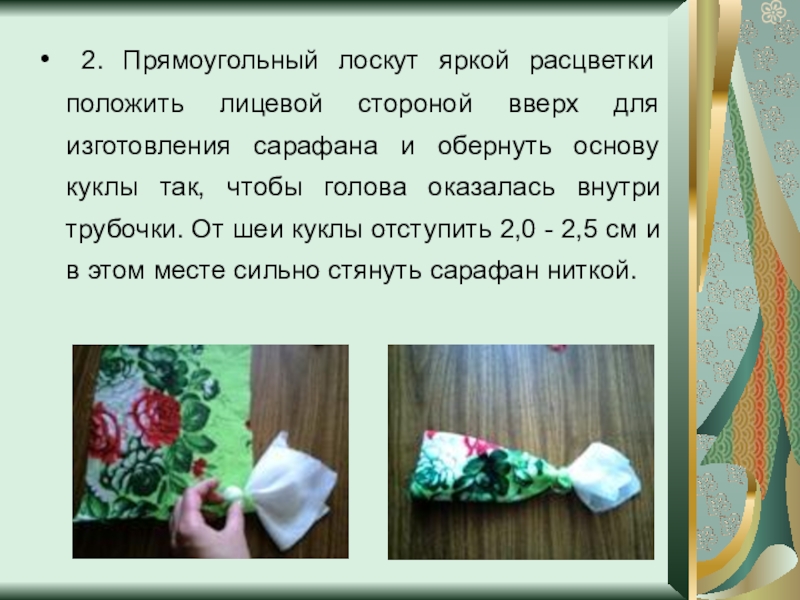 Слайд 6 2. Прямоугольный лоскут яркой расцветки положить лицевой стороной вверх для