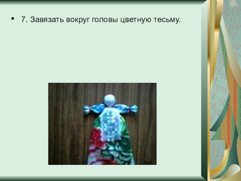 Слайд 11 7. Завязать вокруг головы цветную тесьму.