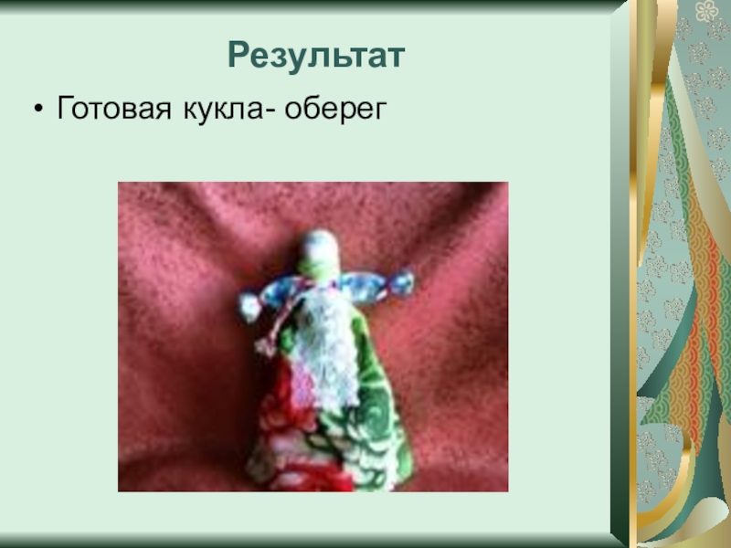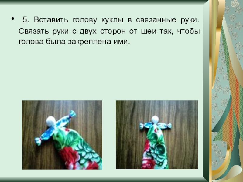 Слайд 9 5. Вставить голову куклы в связанные руки. Связать руки с