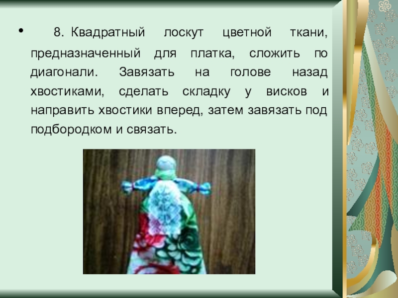 Слайд 12 8. Квадратный лоскут цветной ткани, предназначенный для платка, сложить по