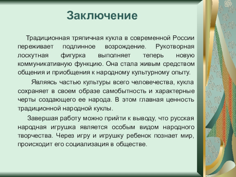 Завершая работу можно прийти к выводу, что русская народная игрушка является особым видом народного творчества. Через игру и игрушку ребенок познает мир, происходит его социализация в обществе.
