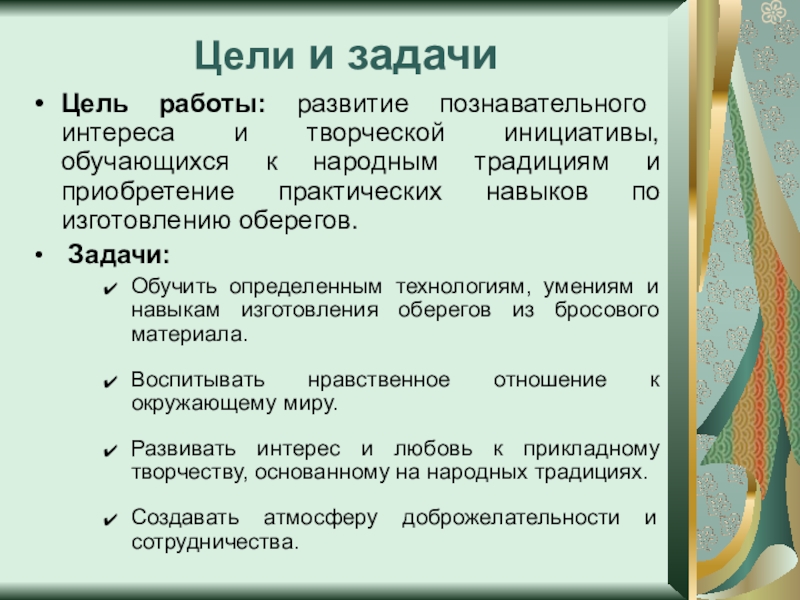 к народным традициям и приобретение практических навыков по изготовлению оберегов.