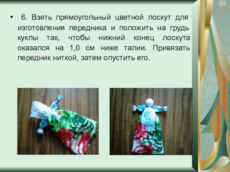 Слайд 10 6. Взять прямоугольный цветной лоскут для изготовления передника и положить