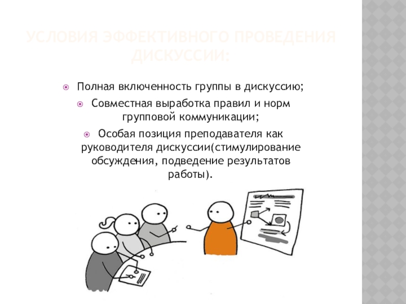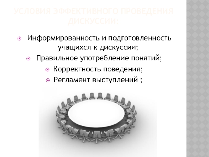 Слайд 8УСЛОВИЯ ЭФФЕКТИВНОГО ПРОВЕДЕНИЯ ДИСКУССИИ: