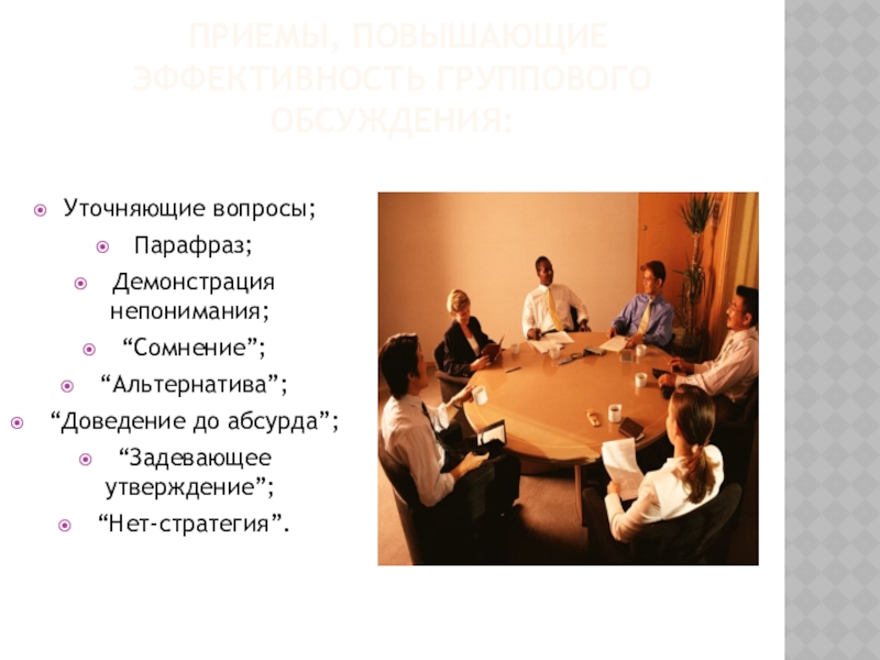 Слайд 12 ПРИЕМЫ, ПОВЫШАЮЩИЕ ЭФФЕКТИВНОСТЬ ГРУППОВОГО ОБСУЖДЕНИЯ: