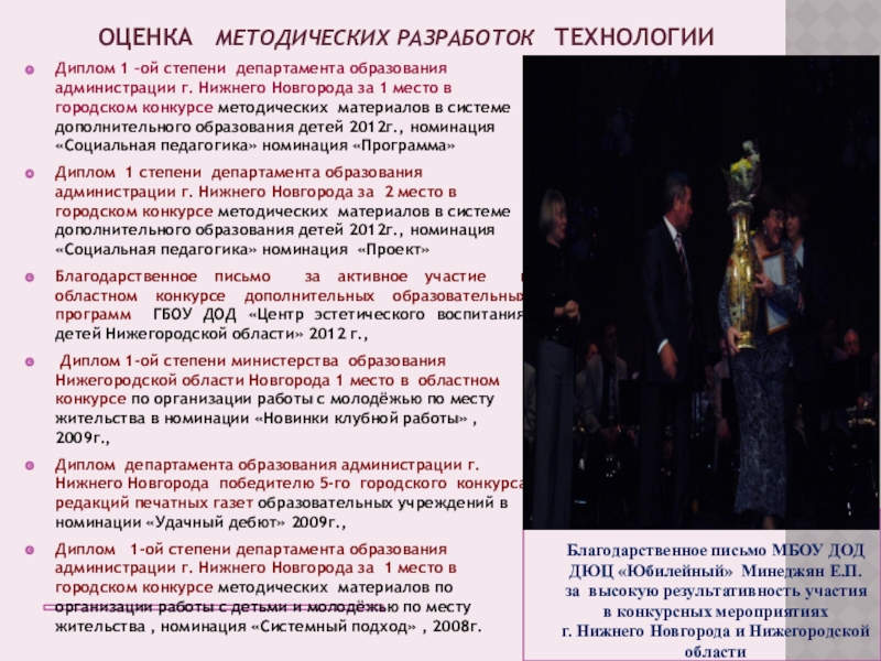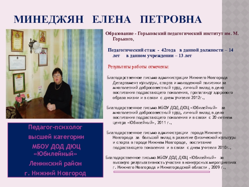 Благодарственное письмо администрации Нижнего Новгорода Департамент культуры, спорта и молодежной политики за многолетний добросовестный труд, личный вклад в дело воспитания подрастающего поколения, пропаганду здорового образа жизни и в связи с днем учителя 2012г.,
