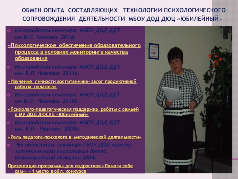 Педагогический стаж - 42года в данной должности – 14 лет в данном учреждении – 13 лет