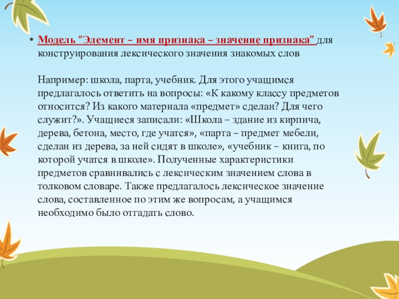 Например: школа, парта, учебник. Для этого учащимся предлагалось ответить на вопросы: «К какому классу предметов относится? Из какого материала «предмет» сделан? Для чего служит?». Учащиеся записали: «Школа – здание из кирпича, дерева, бетона, место, где учатся», «парта – предмет мебели, сделан из дерева, за ней сидят в школе», «учебник – книга, по которой учатся в школе». Полученные характеристики предметов сравнивались с лексическим значением слова в толковом словаре. Также предлагалось лексическое значение слова, составленное по этим же вопросам, а учащимся необходимо было отгадать слово.