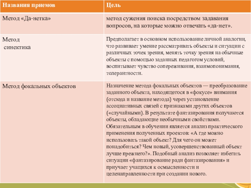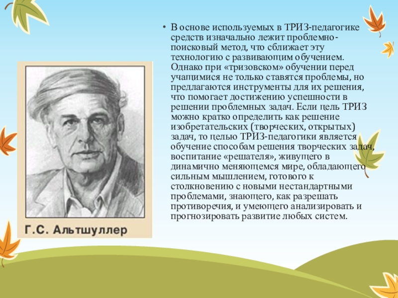 сближает эту технологию с развивающим обучением. Однако при «тризовском» обучении перед учащимися не только ставятся проблемы, но предлагаются инструменты для их решения, что помогает достижению успешности в решении проблемных задач. Если цель ТРИЗ можно кратко определить как решение изобретательских (творческих, открытых) задач, то целью ТРИЗ-педагогики является обучение способам решения творческих задач, воспитание «решателя», живущего в динамично меняющемся мире, обладающего сильным мышлением, готового к столкновению с новыми нестандартными проблемами, знающего, как разрешать противоречия, и умеющего анализировать и прогнозировать развитие любых систем.