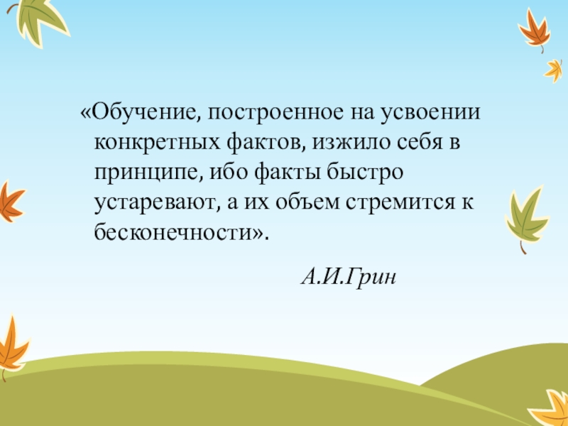 Слайд 2«Обучение, построенное на усвоении конкретных фактов, изжило себя в принципе, ибо