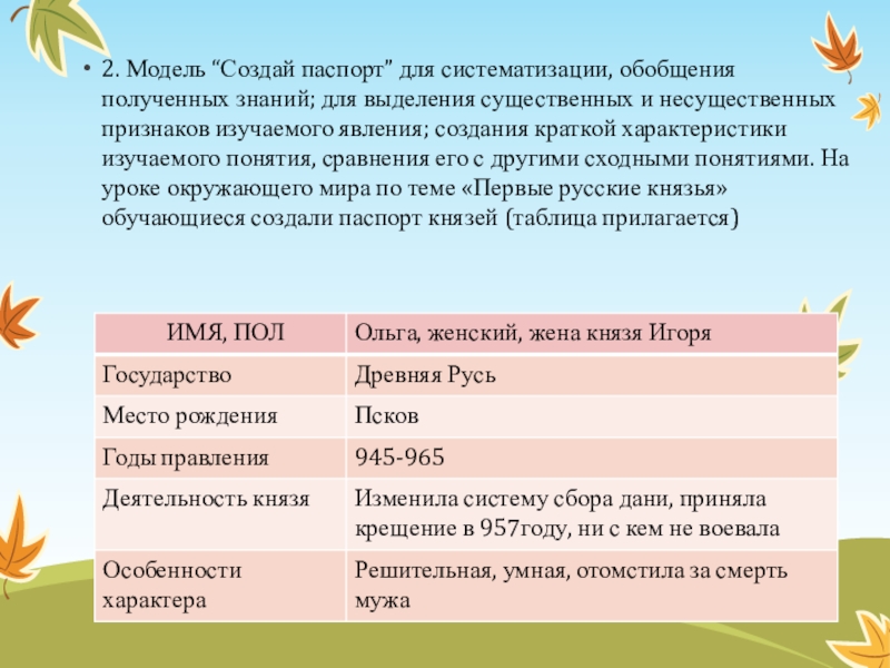 существенных и несущественных признаков изучаемого явления; создания краткой характеристики изучаемого понятия, сравнения его с другими сходными понятиями. На уроке окружающего мира по теме «Первые русские князья» обучающиеся создали паспорт князей (таблица прилагается)