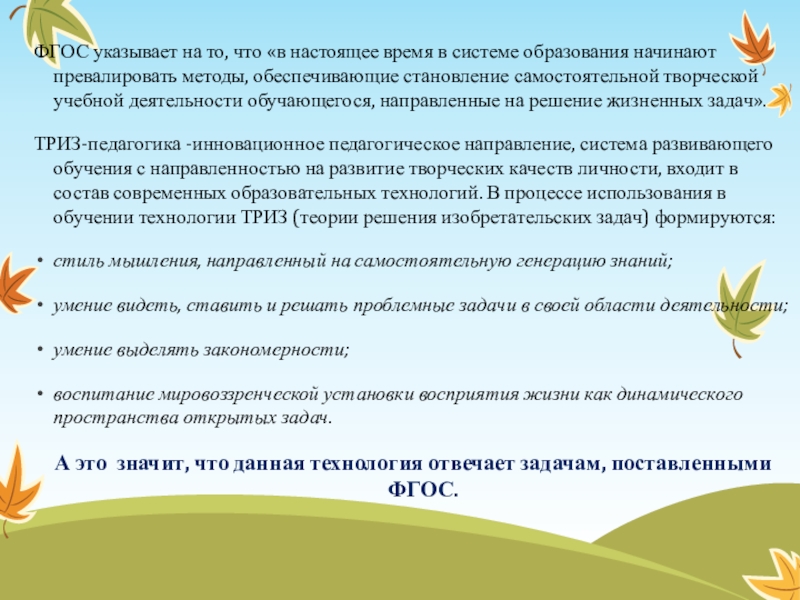ТРИЗ-педагогика -инновационное педагогическое направление, система развивающего обучения с направленностью на развитие творческих качеств личности, входит в состав современных образовательных технологий. В процессе использования в обучении технологии ТРИЗ (теории решения изобретательских задач) формируются: