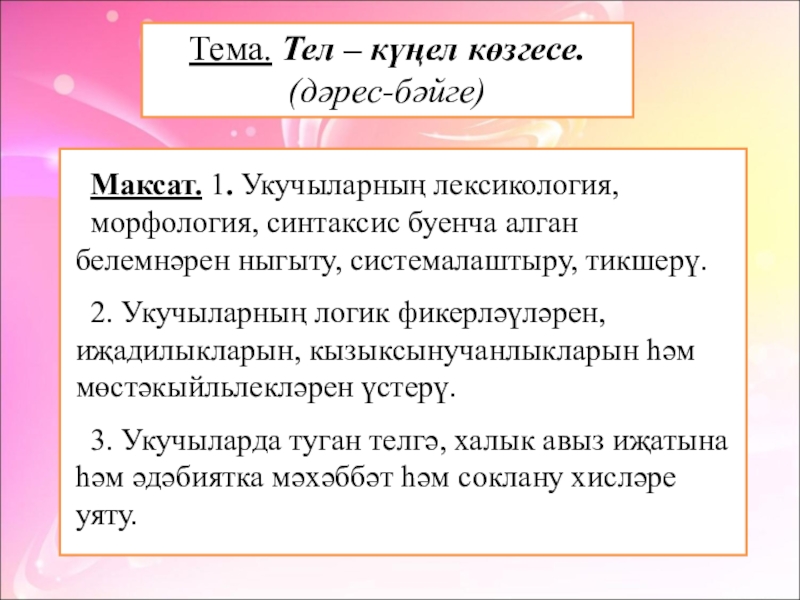 3. Укучыларда туган телгә, халык авыз иҗатына һәм әдәбиятка мәхәббәт һәм соклану хисләре уяту.