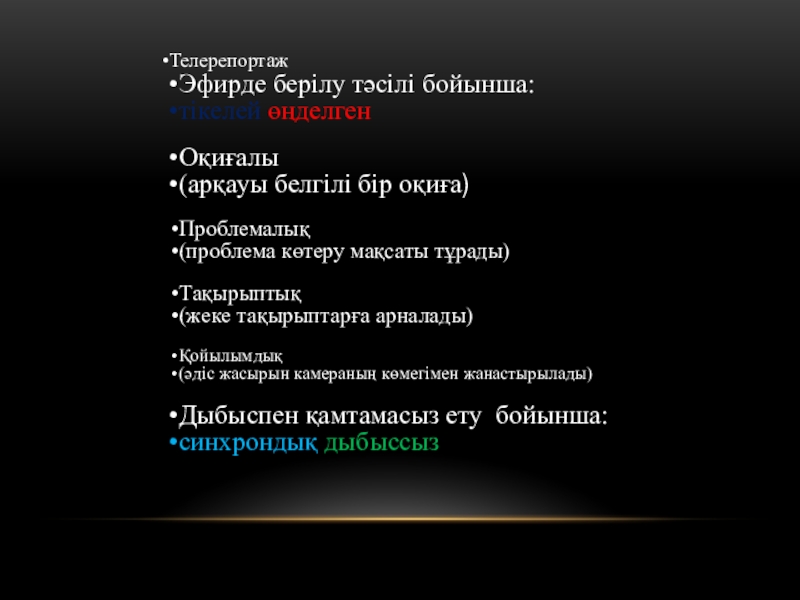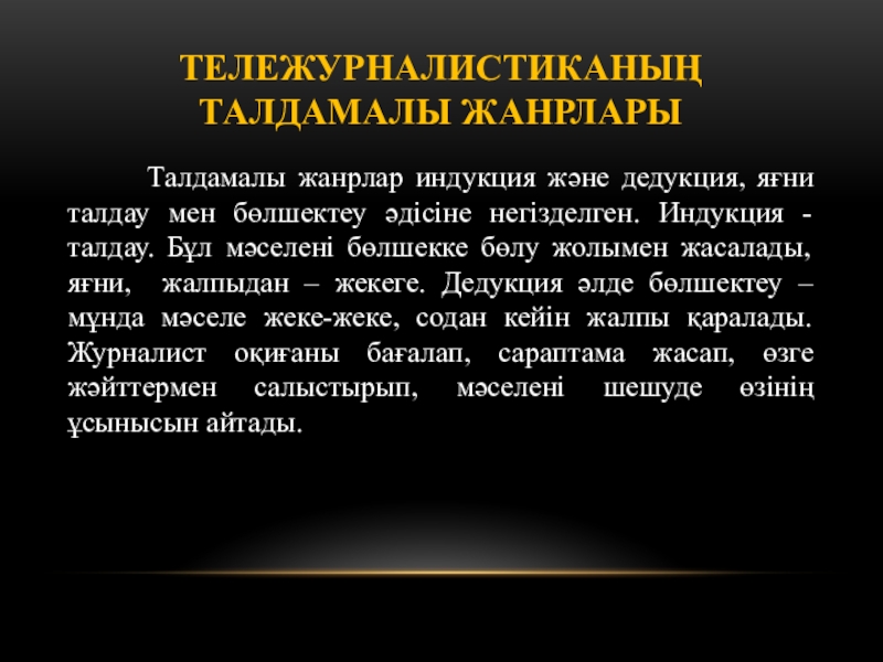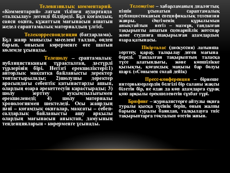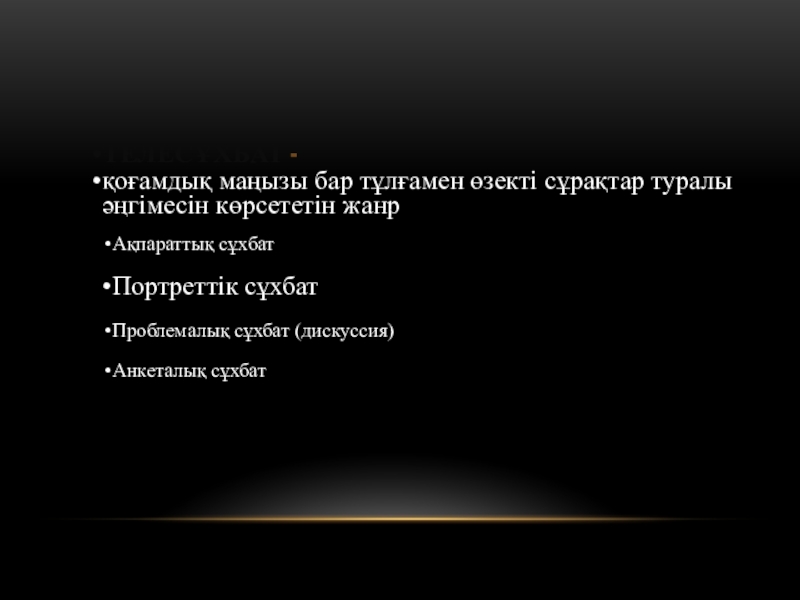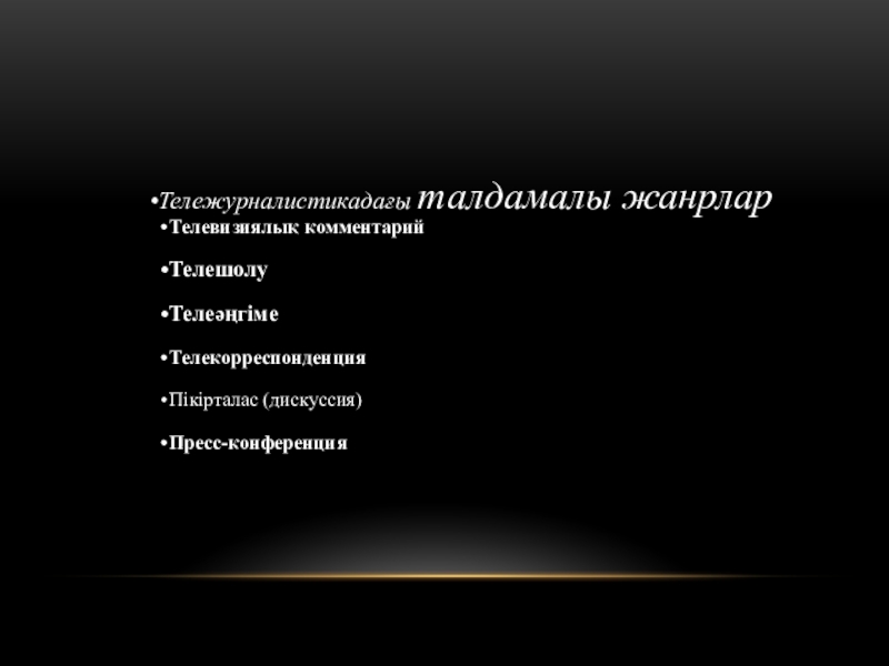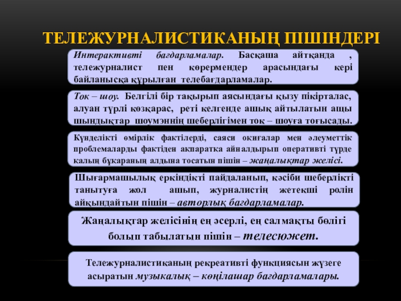 Ток – шоу. Белгілі бір тақырып аясындағы қызу пікірталас, алуан түрлі көзқарас, реті келгенде ашық айтылатын ащы шындықтар шоумэннің шеберлігімен ток – шоуға тоғысады.