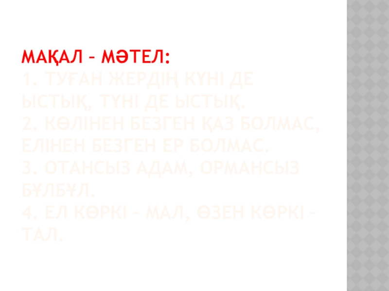 Слайд 57Мақал – мәтел: 1. Туған жердің күні де ыстық, түні де ыстық. 2.