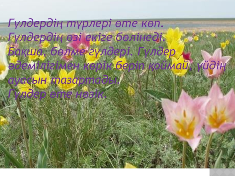 Слайд 19Гүлдердің түрлері өте көп. Гүлдердің өзі екіге бөлінеді. Бақша, бөлме гүлдері. Гүлдер әдемілігімен