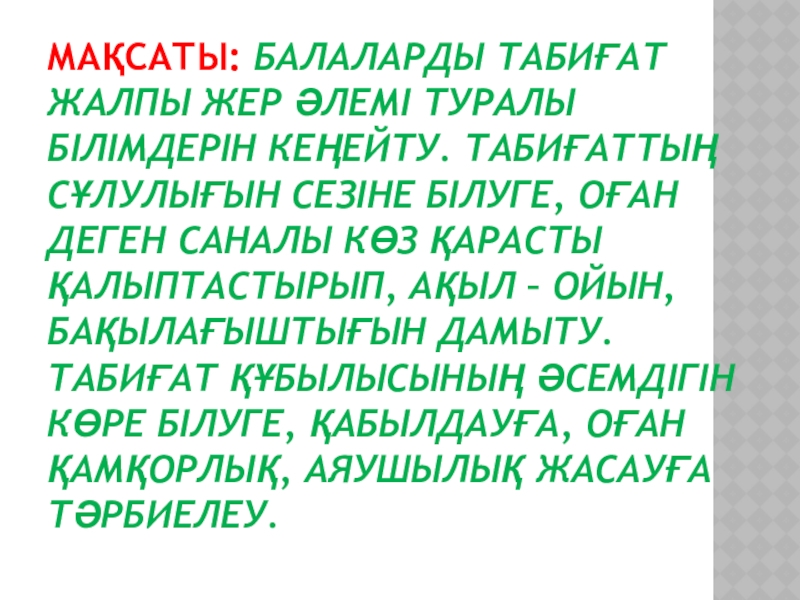 Слайд 2Мақсаты: Балаларды табиғат жалпы жер әлемі туралы білімдерін кеңейту. Табиғаттың сұлулығын