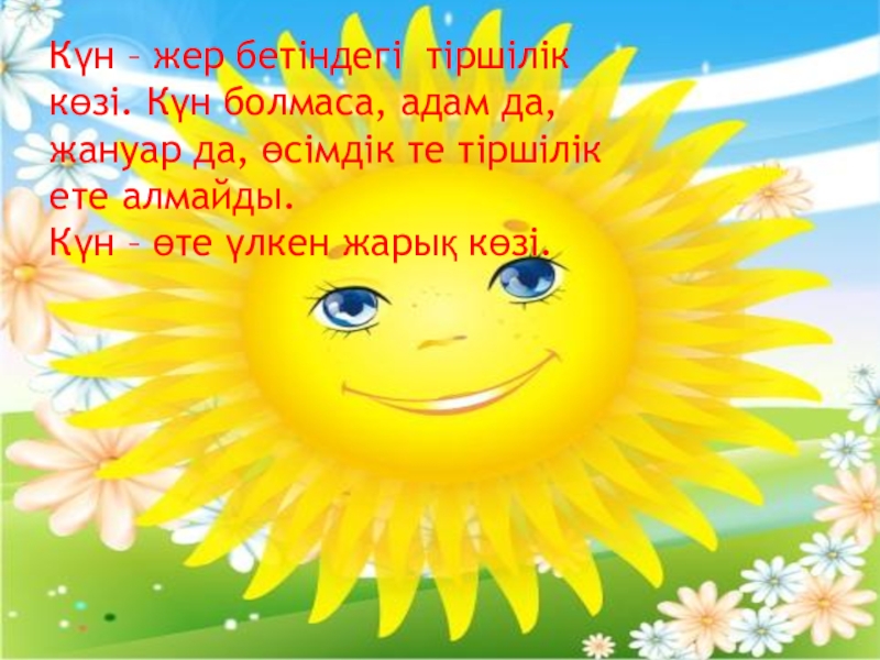 Күн – жер бетіндегі тіршілік көзі. Күн болмаса, адам да, жануар да, өсімдік те тіршілік ете алмайды.