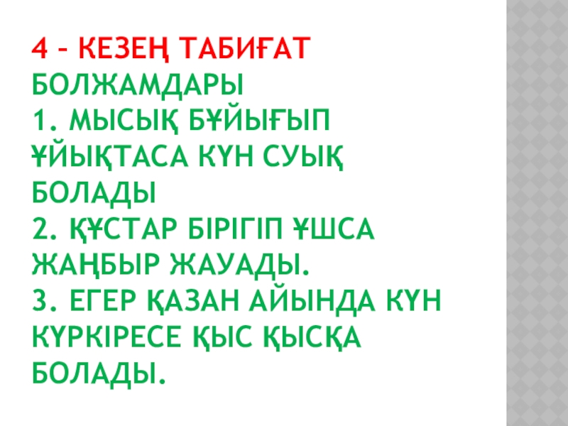 4 – кезең табиғат болжамдары 1. мысық бұйығып ұйықтаса күн суық болады 2. Құстар бірігіп ұшса