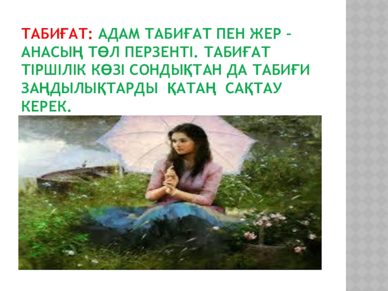 Слайд 60Табиғат: Адам табиғат пен жер – анасың төл перзенті. Табиғат тіршілік