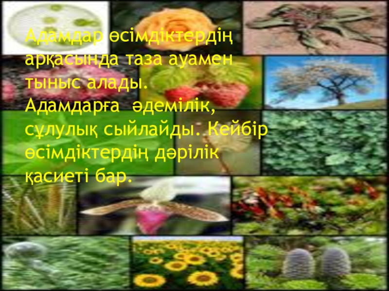 Слайд 35Адамдар өсімдіктердің арқасында таза ауамен тыныс алады. Адамдарға әдемілік, сұлулық сыйлайды. Кейбір