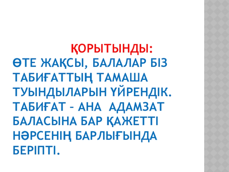 біз табиғаттың тамаша туындыларын үйрендік. Табиғат – Ана адамзат баласына бар қажетті нәрсенің барлығында беріпті.