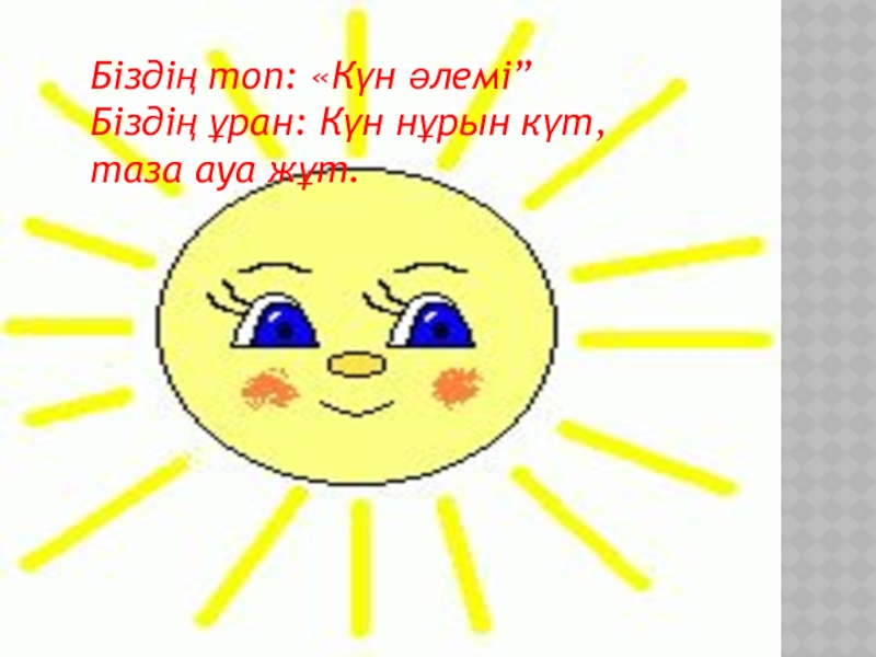 Слайд 11Біздің топ: «Күн әлемі” Біздің ұран: Күн нұрын күт, таза ауа