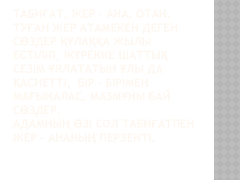 Слайд 8Табиғат, Жер – Ана, Отан, туған жер атамекен деген сөздер құлаққа