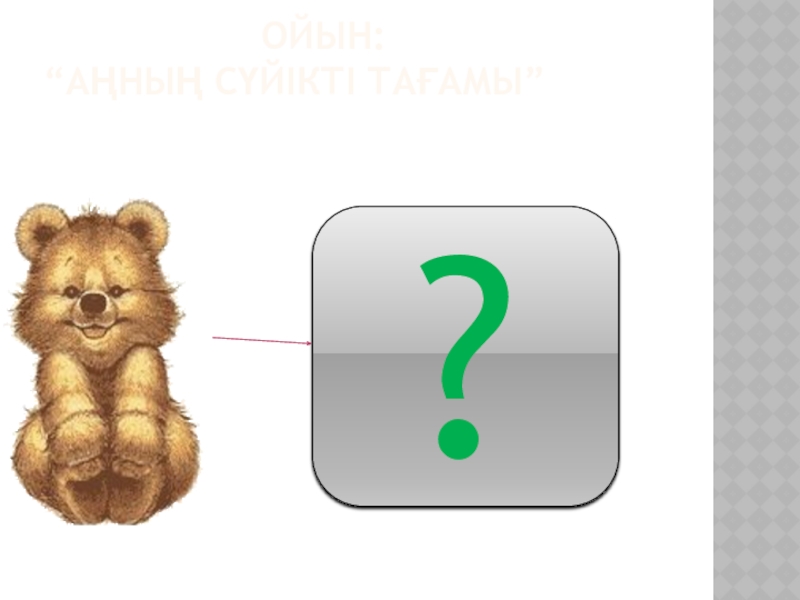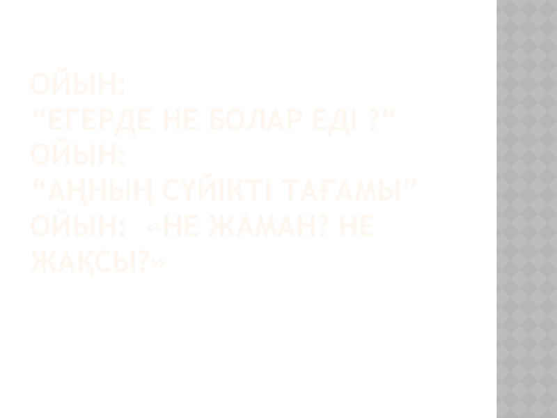 Слайд 39Ойын: “Егерде не болар еді ?” ойын: “Аңның сүйікті тағамы” Ойын: «Не жаман?