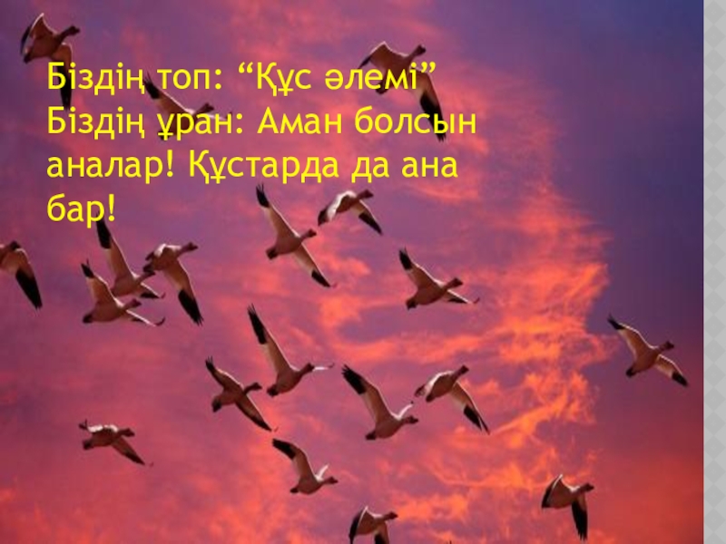 Біздің топ: “Құс әлемі” Біздің ұран: Аман болсын аналар! Құстарда да ана бар!